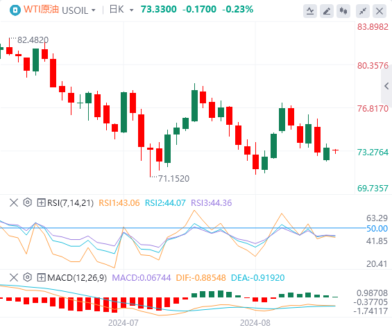 周二亚盘 ,原油交投于73.33附近。中国8月份制造业活动放缓对WTI价格造成了一些抛售压力 。围绕利比亚石油产量的供应担忧可能会限制其下行空间 。中国经济低迷和石油需求放缓引发了人们对世界最大石油进口国经济健康状况的担忧,这令WTI价格承压。国家统计局公布的数据显示,中国制造业在8月份出现下滑 ,创下六个月新低。中国官方制造业采购经理人指数(PMI)8月降至49.1,而前值为49.54 。该读数低于报告月份49.5的市场共识。   技术面:原油市场再次陷入震荡区间。WTI油价震荡于72.00美元和77.00美元区间 ,但继从7月高位84.00美元附近以来的中线下跌后,使得WTI油价遇阻200指数移动均线78.00美元附近 。