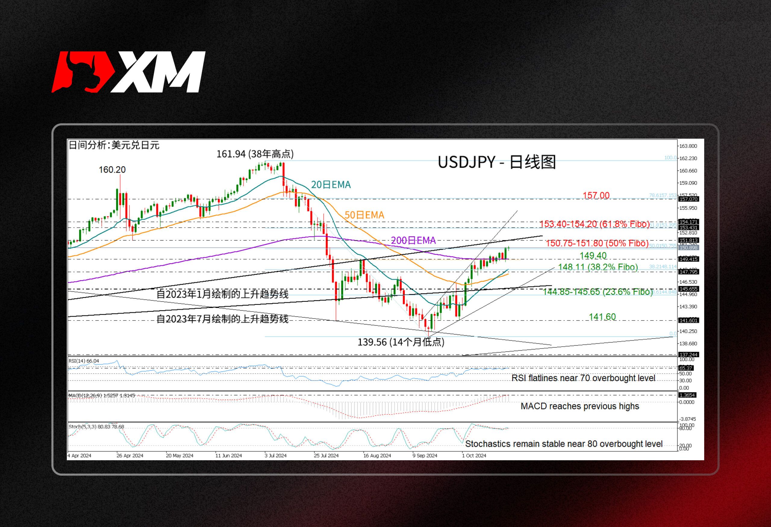 尽管如此 ,技术指标正发布警示信号 。相对强弱指数(RSI)和随机震荡指标在超买水平附近盘整。目前多头可能在7-9月下行趋势的斐波那契回调线50%位置的价格150.75附近遇阻。